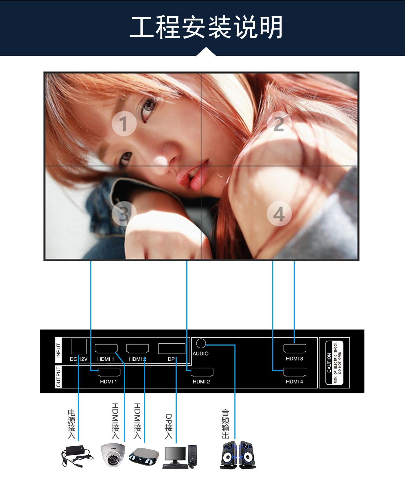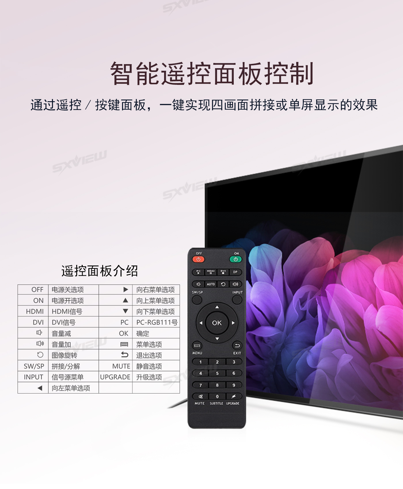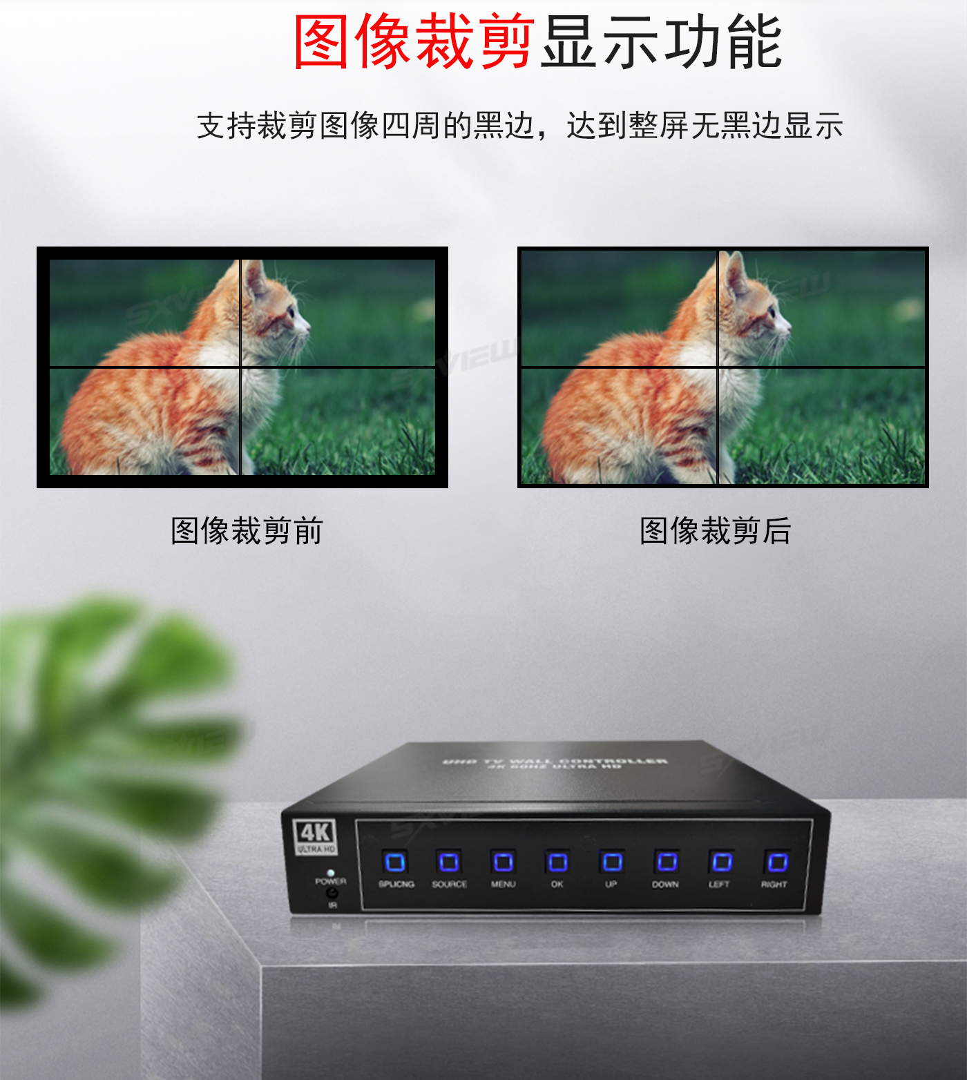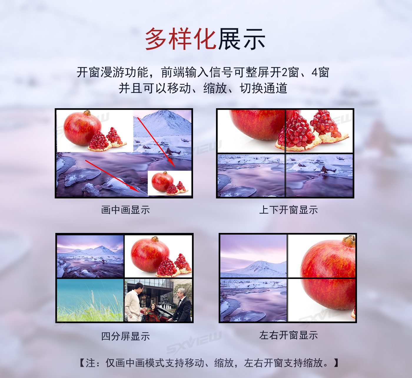 盛显科技研发生产的一款高性能的UHD超高清4K多画面拼接器,单机最多可支持16块显示单元拼接显示一副超清画面。其主要功能是在MxN的拼接显示单元上显示一幅3840x2160@60Hz的超高清图像,产品独有算法可以同时支持2个画面、4个画面同时显示,2画面情况下支持移动缩放等功能,并且支持90度、270度信号旋转拼接,支持一键模式调用等等特色功能。产品采用先进的DSP+FPGA图像处理技术,输入信号最大可以支持HDMI2.0(HDCP2.2),即3840x2160@60HZ,即使在播放快速动画的时候也不会出现延时、丢帧现像。超清4K多画面拼接器以其优越的性能和高分辨显示特点,广泛应用于需要显示高清视频图像的展示厅,以及需要显示更多清晰丰富细节一些特定场所,比如军队作战地图、GPS定位系统、石油管理监控、卫星定位等各种需要超大分辨率显示的工作环境。
