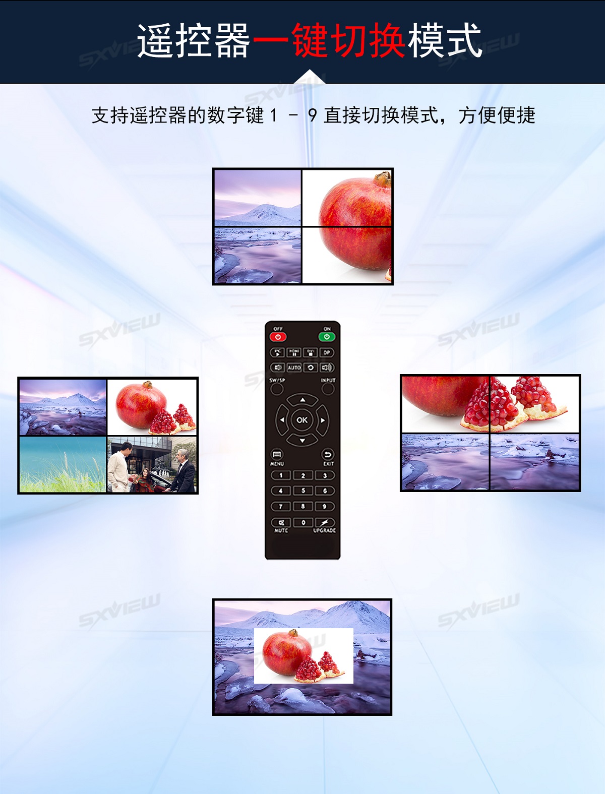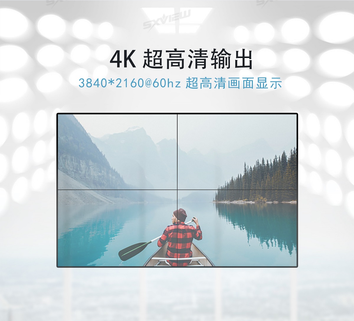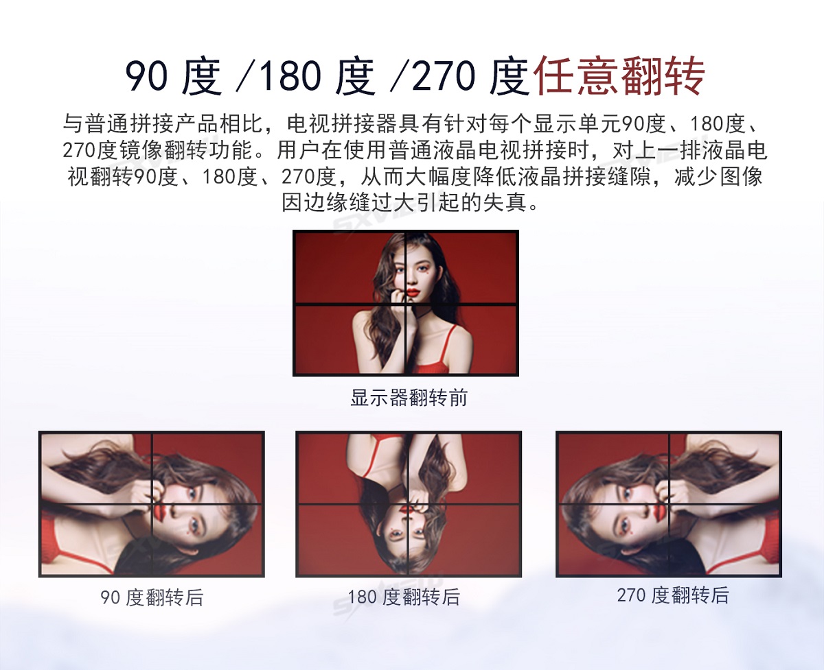 盛显科技研发生产的一款高性能的UHD超高清4K多画面拼接器,单机最多可支持16块显示单元拼接显示一副超清画面。其主要功能是在MxN的拼接显示单元上显示一幅3840x2160@60Hz的超高清图像,产品独有算法可以同时支持2个画面、4个画面同时显示,2画面情况下支持移动缩放等功能,并且支持90度、270度信号旋转拼接,支持一键模式调用等等特色功能。产品采用先进的DSP+FPGA图像处理技术,输入信号最大可以支持HDMI2.0(HDCP2.2),即3840x2160@60HZ,即使在播放快速动画的时候也不会出现延时、丢帧现像。超清4K多画面拼接器以其优越的性能和高分辨显示特点,广泛应用于需要显示高清视频图像的展示厅,以及需要显示更多清晰丰富细节一些特定场所,比如军队作战地图、GPS定位系统、石油管理监控、卫星定位等各种需要超大分辨率显示的工作环境。