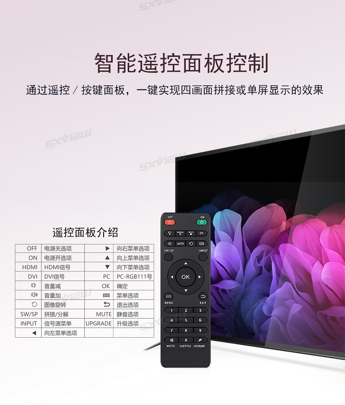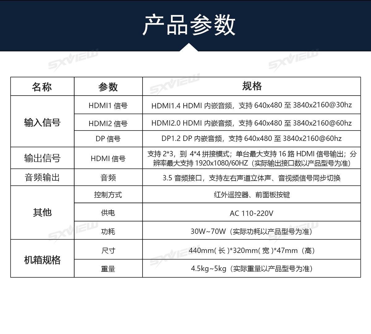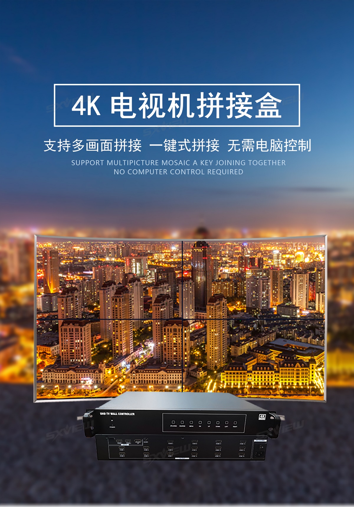 盛显科技研发生产的一款高性能的UHD超高清4K多画面拼接器,单机最多可支持16块显示单元拼接显示一副超清画面。其主要功能是在MxN的拼接显示单元上显示一幅3840x2160@60Hz的超高清图像,产品独有算法可以同时支持2个画面、4个画面同时显示,2画面情况下支持移动缩放等功能,并且支持90度、270度信号旋转拼接,支持一键模式调用等等特色功能。产品采用先进的DSP+FPGA图像处理技术,输入信号最大可以支持HDMI2.0(HDCP2.2),即3840x2160@60HZ,即使在播放快速动画的时候也不会出现延时、丢帧现像。超清4K多画面拼接器以其优越的性能和高分辨显示特点,广泛应用于需要显示高清视频图像的展示厅,以及需要显示更多清晰丰富细节一些特定场所,比如军队作战地图、GPS定位系统、石油管理监控、卫星定位等各种需要超大分辨率显示的工作环境。