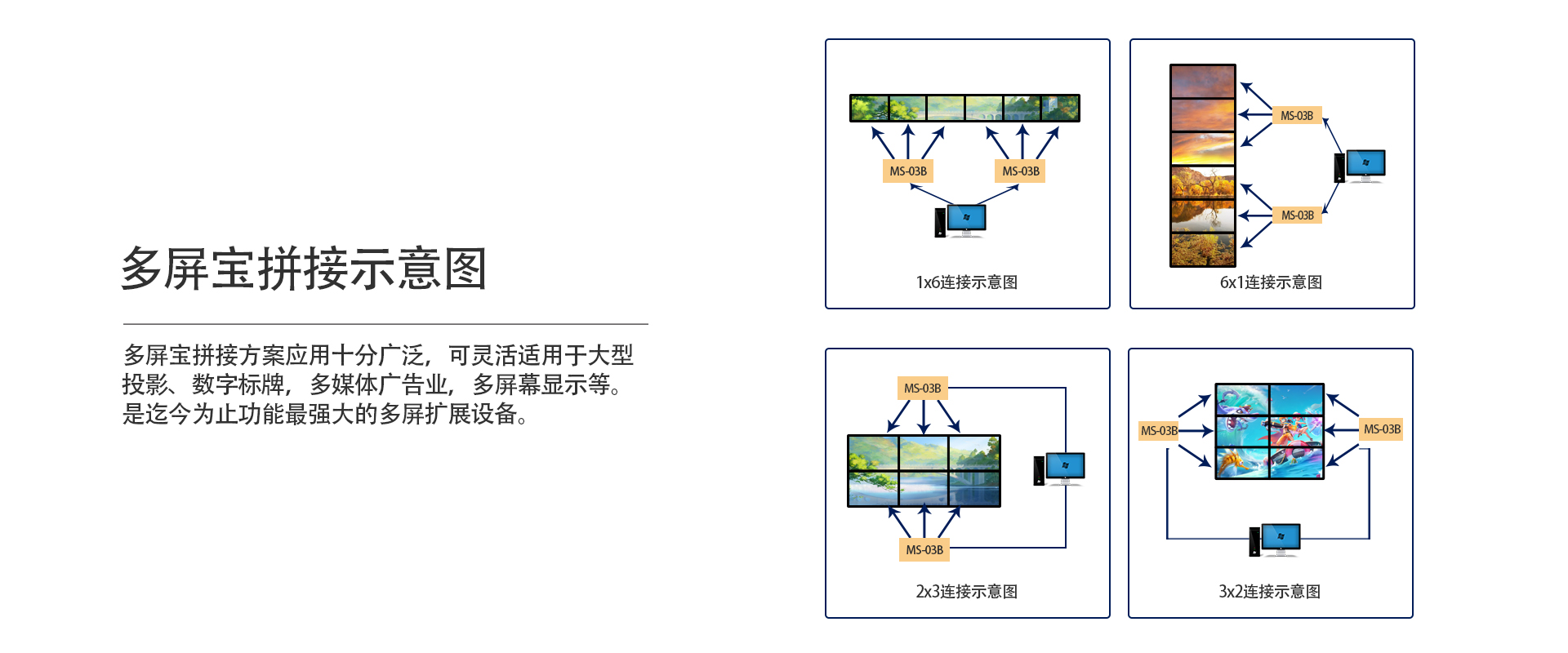 多屏宝(二屏宝、二屏扩展仪)作为一种超高性价比的多屏扩展设备,其结合NVIDA、AMD等专业图形卡,可以实现1*N、N*1、M*N以及90度旋转等比拼接显示,不变性,不拉伸,可广泛应用于超高分辨率桌面应用、超大屏幕墙、指挥调度系统、多屏幕视频监控、工程显示应用,多通道投影、虚拟现实、环幕影院、大型广告墙、LCD/LED拼接屏等。