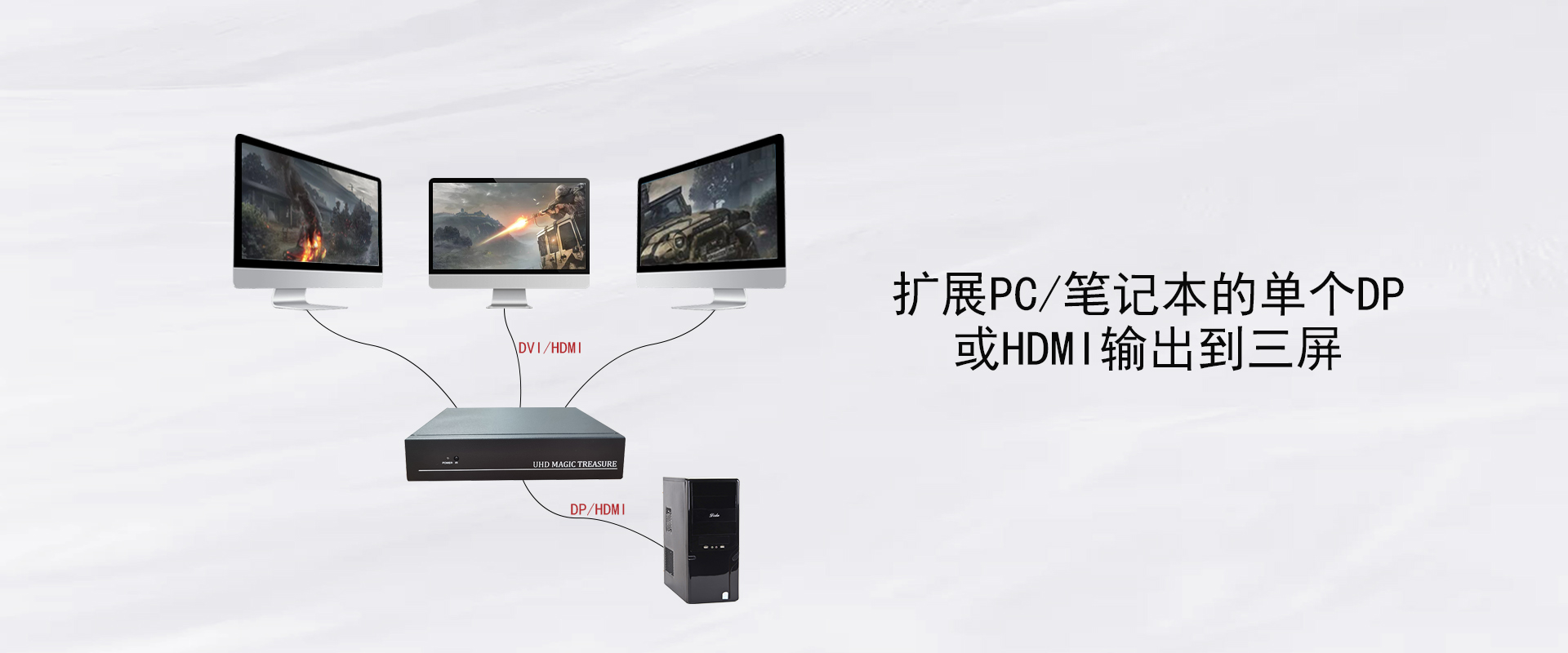 多屏宝也称多屏扩展仪、多屏显示处理器等,其作用是实现一机多屏显示,即一台主机将内容显示到多台显示器上,根据同的需求可以将不同的画面显示到不同的显示屏上,是一种实现多屏显示效果的高性价比方式。