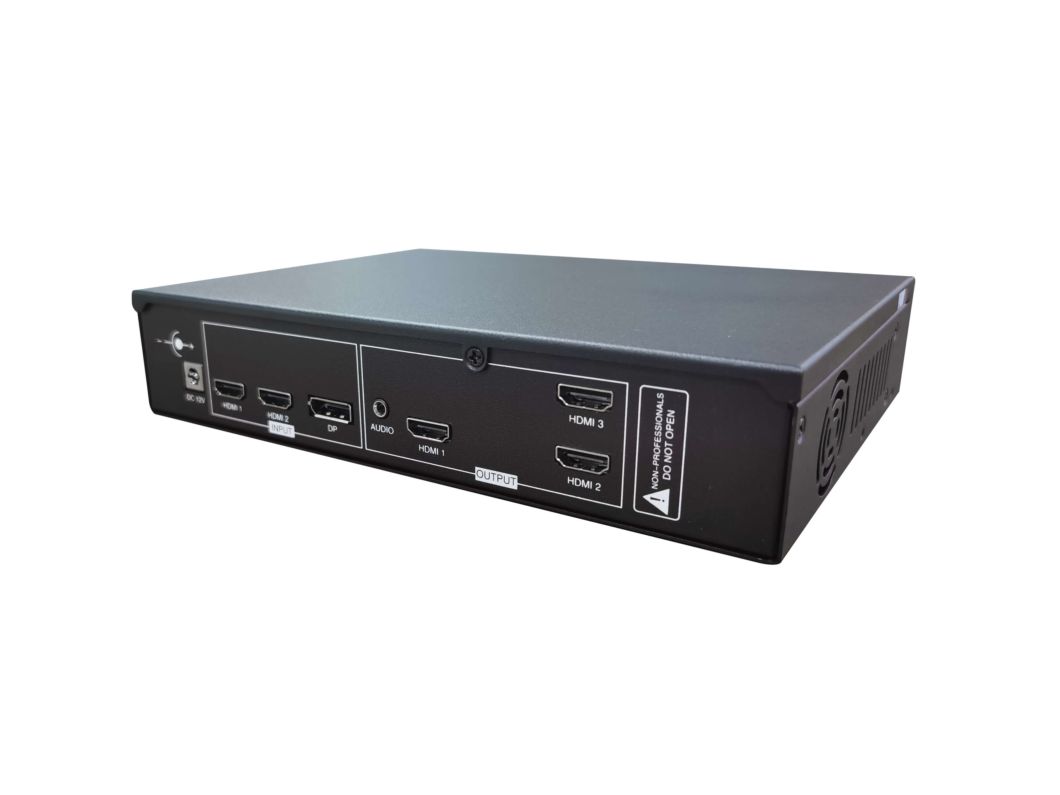 5. 最大支持1进4出,可轻松实现横向、纵向拼接及垂直拼接分割,并支持通过并联方式实现更大规模的1xN,Nx1,MxN以及旋转90°等比拼接显示,不拉伸,不变形;
