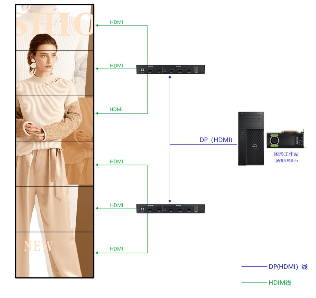 多屏宝作为一种超高性价比的多屏扩展设备,其结合NVIDA、AMD等专业图形卡,根据显示屏数量及分辨率等比例拼接显示,可以实现3×1、4×1、5×1、M×1等竖条形拼接模式,点对点显示,不变形,不拉伸,应用于数字化展厅、新零售、媒体广告业、数字标牌等。