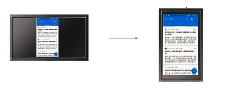 大部分的国内APP,不允许横屏运行。竖版APP投射至屏幕,默认两边会出现黑边。如何实现旋转九十度投射至屏幕?需要哪些特别的硬件设备支持? 已测小米、天猫、乐视盒子/电视,都不支持横屏显示APP。如何从左面的图像通过设备达到右边的效果呢?