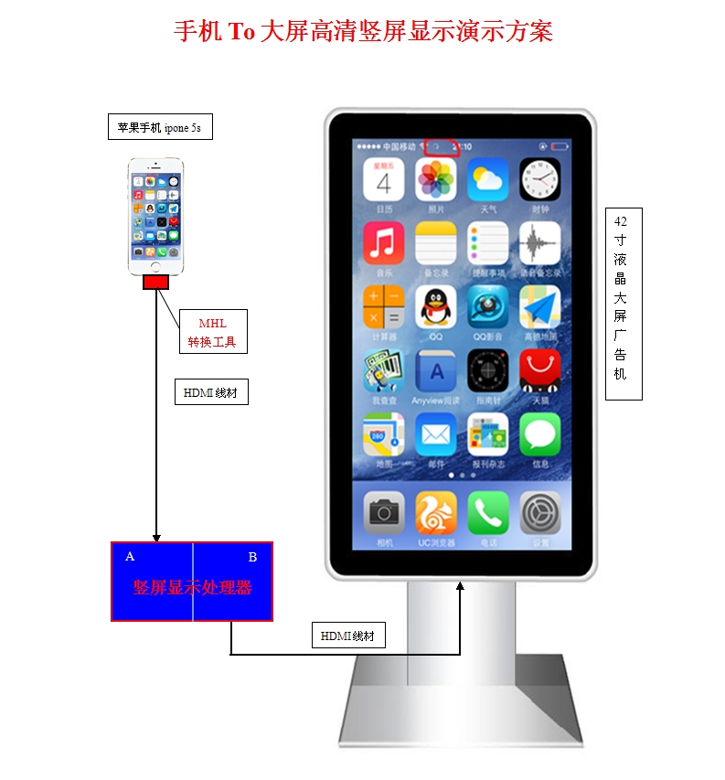 目前Android手机4.2及以上版本、Iphone5、Iphone6均支持此功能,只需要增加一个普通的手机同屏器与我们设备进行连接,配置后即可竖屏显示手机界面及其它内容。