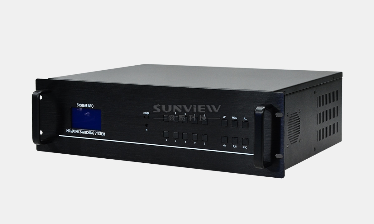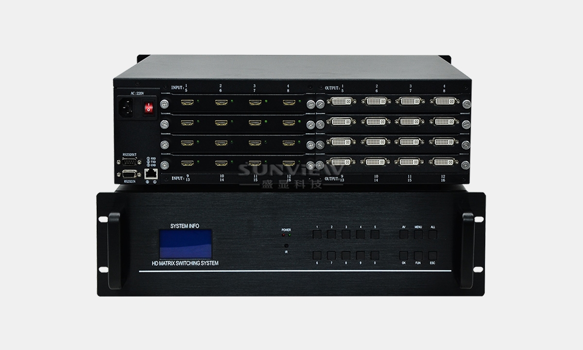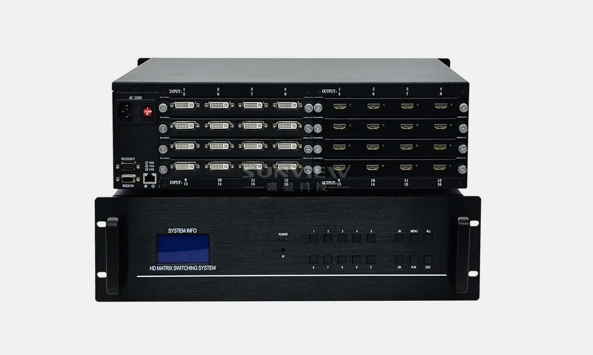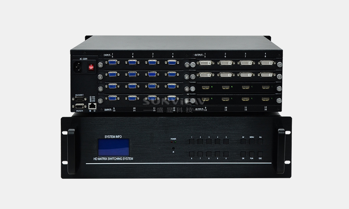 高清混合矩阵是盛显研发生产的一台16端口输入输出的新一代数字模拟混合插卡式矩阵系统。采用插卡式机箱设计,可支持16路不同信号源输入与16路的输出,信号接口自由组合,可选择VGA、DVI、3G-SDI、DP、HDMI、CVBS等接口形式作为输入输出,解决了视频会议项目中由于视频信号源种类繁多,各种信号不兼容的困难,大程度的节省成本,利于系统升级、扩容及维护。随着数字化科技不断地发展,在的音视频信号处理已经出现了多元化,传统的矩阵已经不能满足会议系统工程的需求了。相比传统矩阵,新一代混合插卡矩阵具有灵活多变,切换方便,适用范围广等特点,从而越来越受人们的关注。一款好的插卡矩阵不但要具备切换速度快、插卡更换方便、图像处理性能优越、操作简单方便、而且能够和其他控制设备兼容。