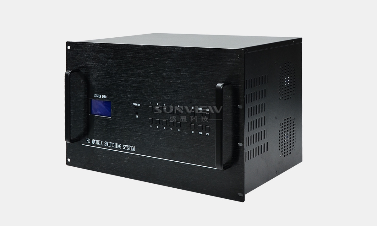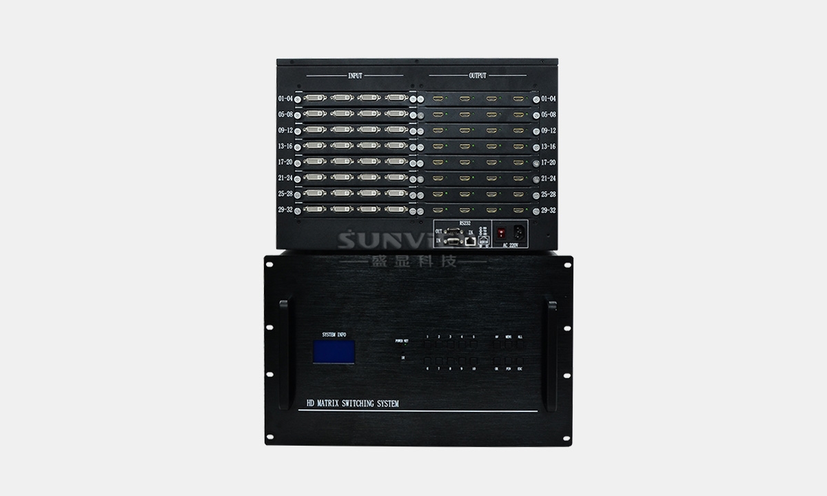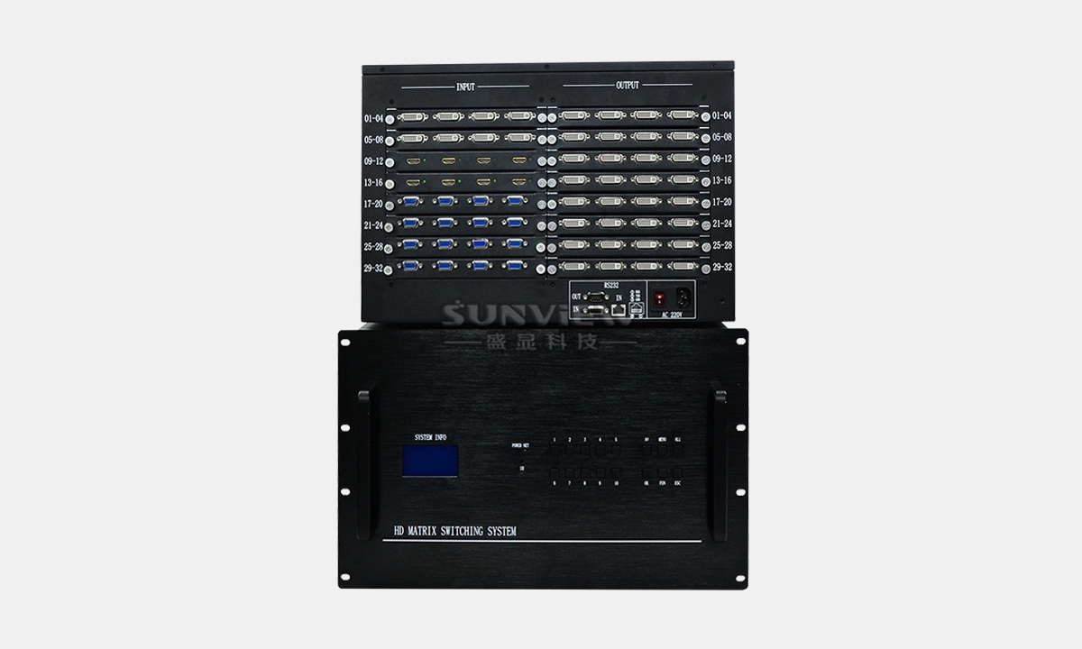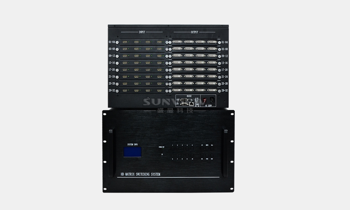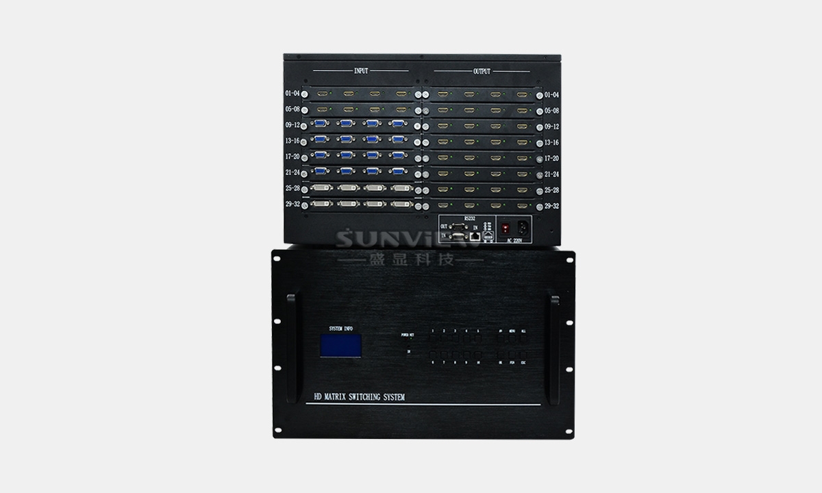 高清混合矩阵是盛显研发生产的一台32端口输入输出的新一代数字模拟混合插卡式矩阵系统。采用插卡式机箱设计,可支持32路不同信号源输入与8路的输出,信号接口自由组合,可选择VGA、DVI、3G-SDI、DP、HDMI、CVBS等接口形式作为输入输出,解决了视频会议项目中由于视频信号源种类繁多,各种信号不兼容的困难,大程度的节省成本,利于系统升级、扩容及维护。随着数字化科技不断地发展,在的音视频信号处理已经出现了多元化,传统的矩阵已经不能满足会议系统工程的需求了。相比传统矩阵,新一代混合插卡矩阵具有灵活多变,切换方便,适用范围广等特点,从而越来越受人们的关注。一款好的插卡矩阵不但要具备切换速度快、插卡更换方便、图像处理性能优越、操作简单方便、而且能够和其他控制设备兼容。