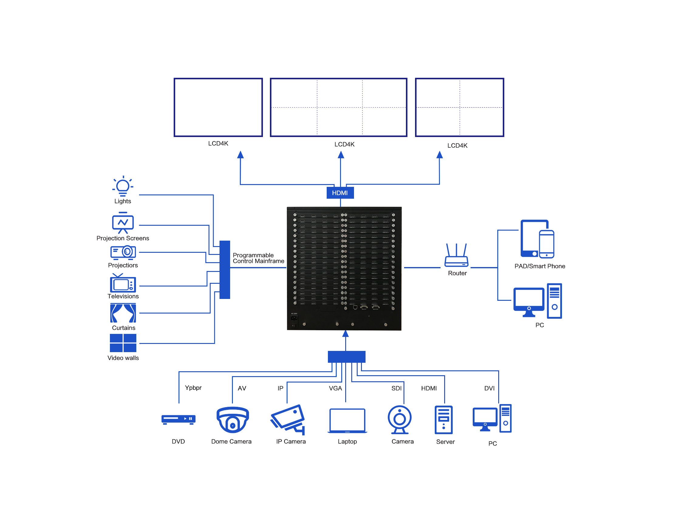 可根据用户需求,通过定制开发,实现对第三方设备的控制,如拼接屏的开关机、矩阵的切换控制以及窗帘、灯光等环境设备的控制。