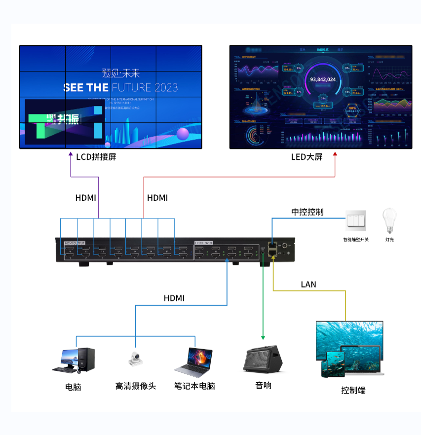 支持多个信号源上墙、拼接、漫游、跨屏、放大缩小、画中画、画外画、画面叠加等各种方式的显示功能,支持PC、平板等多种控制方式。