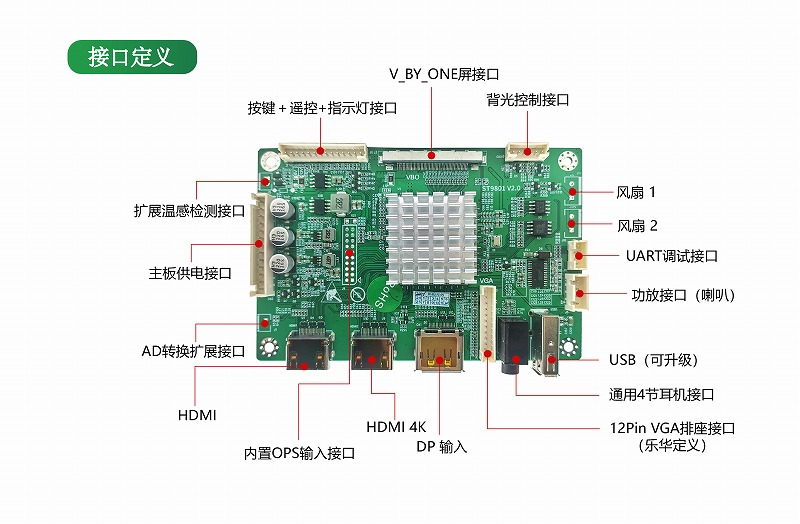 本驱动板能更好解调出各种输入信号。内含强大的视频处理功能,能输出高质量的画面。提供VGA(内接)、DP、HDMI、OPS(内接)等接口,支持1080P(VGA、OPS信号)以内的输入,支持3840×2160@60HZ(HDMI、DP信号)以内高清信号输入,支持4K60Hz V_BY_ONE输出,效果更好并提供逐行的高清晰的视频,该板卡还集成了温控、LED指示灯、按键、遥控、音频输出等便捷功能。