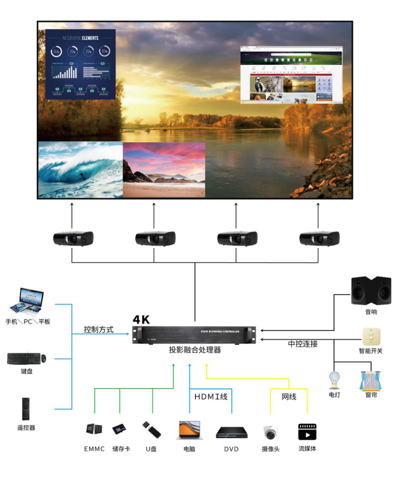 投影融合处理器是一款支持2-9通道MxN融合的处理器,单口最大分辨率支持1920x1200@60Hz,可广泛应用于展览展示、企业活动、娱乐、会议等场合。 设备支持一路4K HDMI输入,支持本地视频文件或网络视频文件开窗,支持USB3.0和TF卡的接入,支持串口控制输出,支持信号窗口任意叠加漫游,可满足用户日常灵活显示需求。