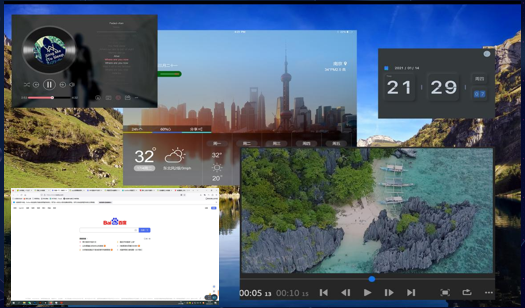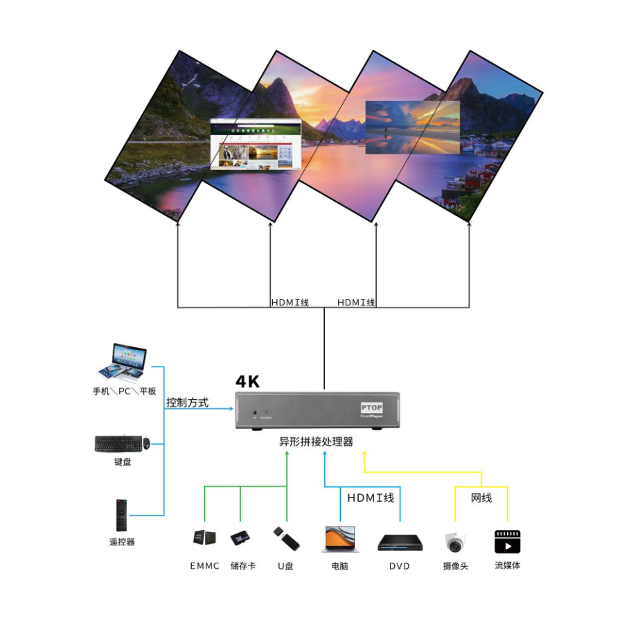 各种音视频文件、图片、Web网页以及4K HDMI采集、网络接入信号能够以窗口的形式动态、实时地显示,并可以任意跨屏拼接、缩放及叠加。
