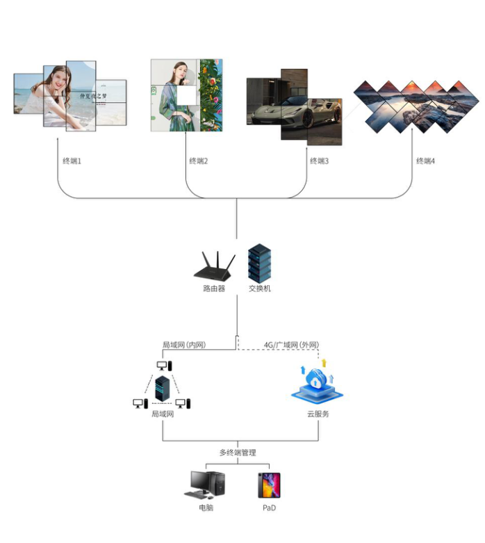 异形拼接处理器利用云技术,通过云端完成对终端设备的管理,包括素材的上传和分发,素材投屏、场景添加等等。