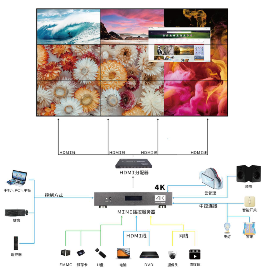 随着客户对显示场景的要求逐渐提升,传统电脑加分配器加拼接屏的模式在高端会议室、展厅、高端零售店、会展等场合越来越难以满足。为此,盛显科技专为 LCD 拼接屏推出的一款专业的 MINI 播控服务器,集多媒体播控、 信息发布、集群管理功能和应用平台为一体,具备强大的交互和播放能力。MINI 播控服务器结合拼接屏可以实现的应用场景如下: