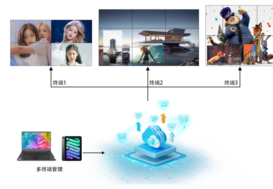 支持多设备统一云端操作,实现设备的远程异地管理,如媒体素材的上传、内容发布、模式切换等。在一些连锁经营店里可以实现总部统一管理、更新点播目录和内容,店面店员随时点播, 权限相互独立。