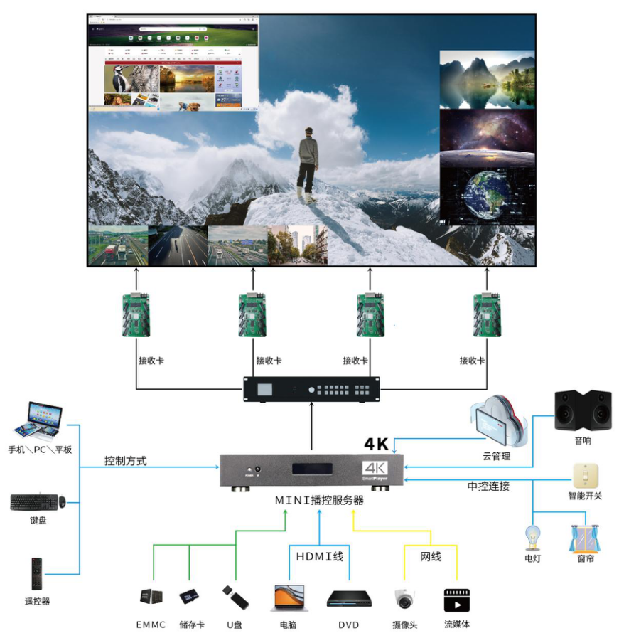 在日常LED显示屏的使用中,MINI播控服务器替代了电脑或者单一播放器的播放模式,并且解决了传统播放器无法实现的一些功能,比如: 预案播放、场景播放、定时播放、视频组合播放等等特色功能的实际需求。