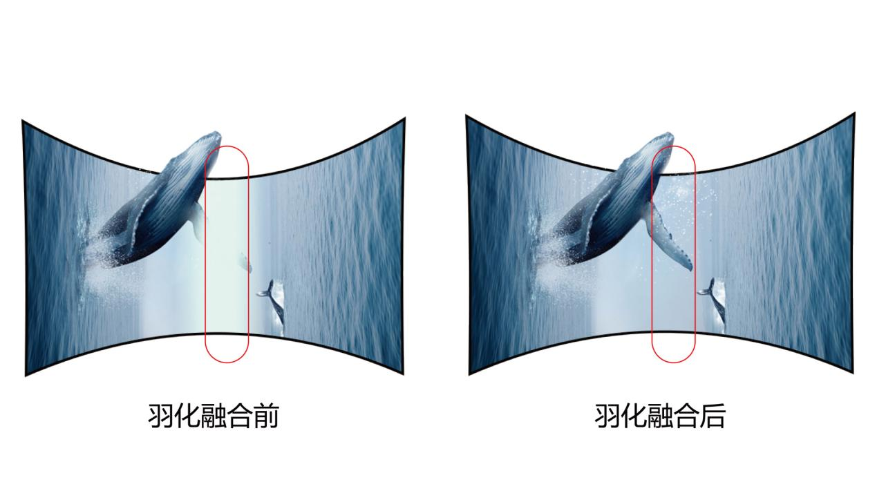 融合带羽化技术是将一组投影机投射出的画面进行边缘重叠羽化,消除投影画面重叠部分形成的亮带,从而达到投影画面融为一体的显示的效果。