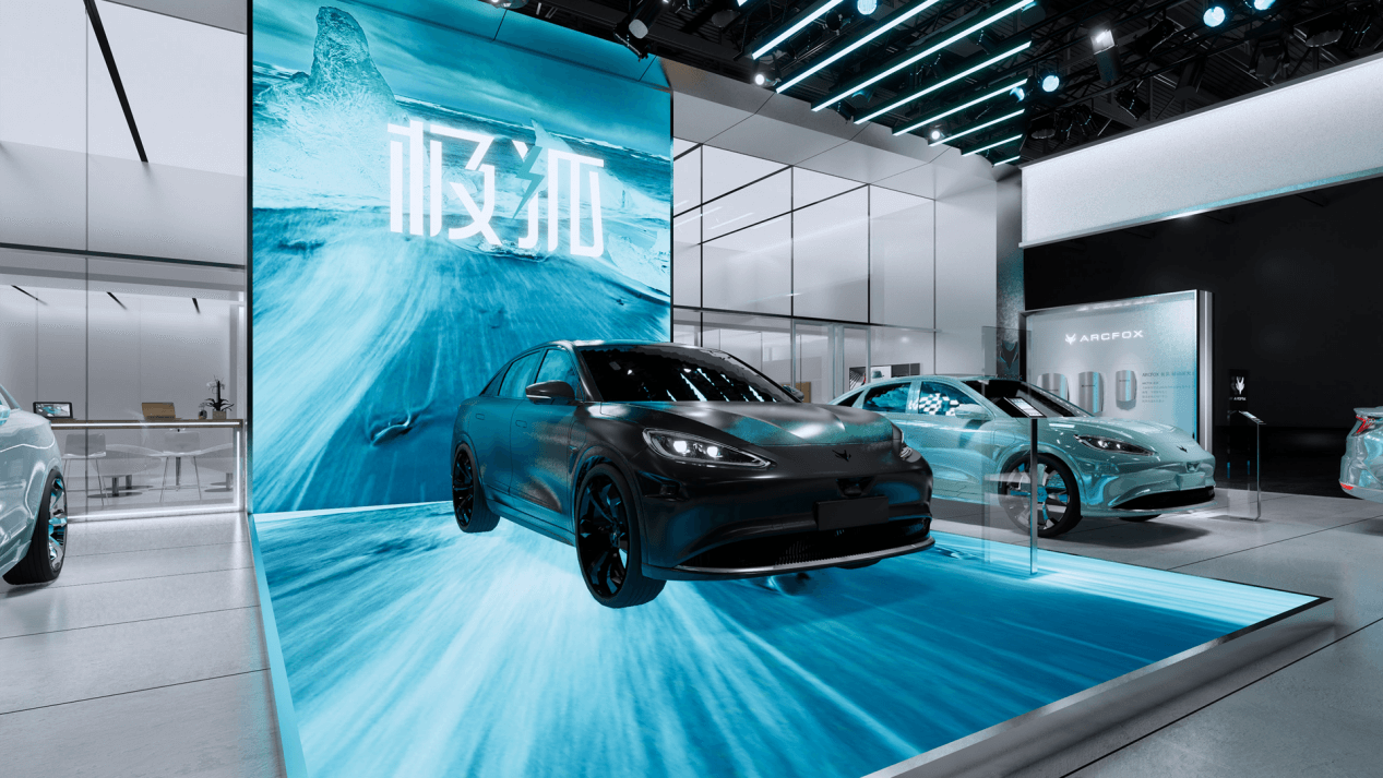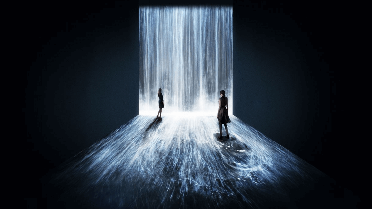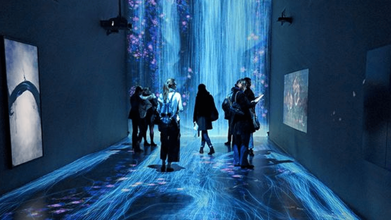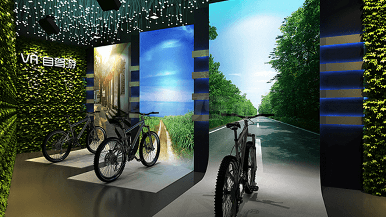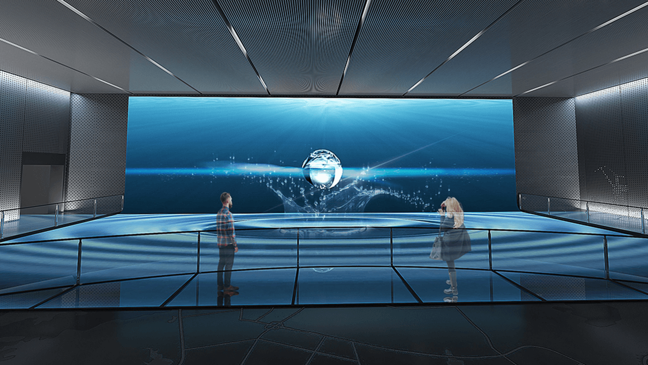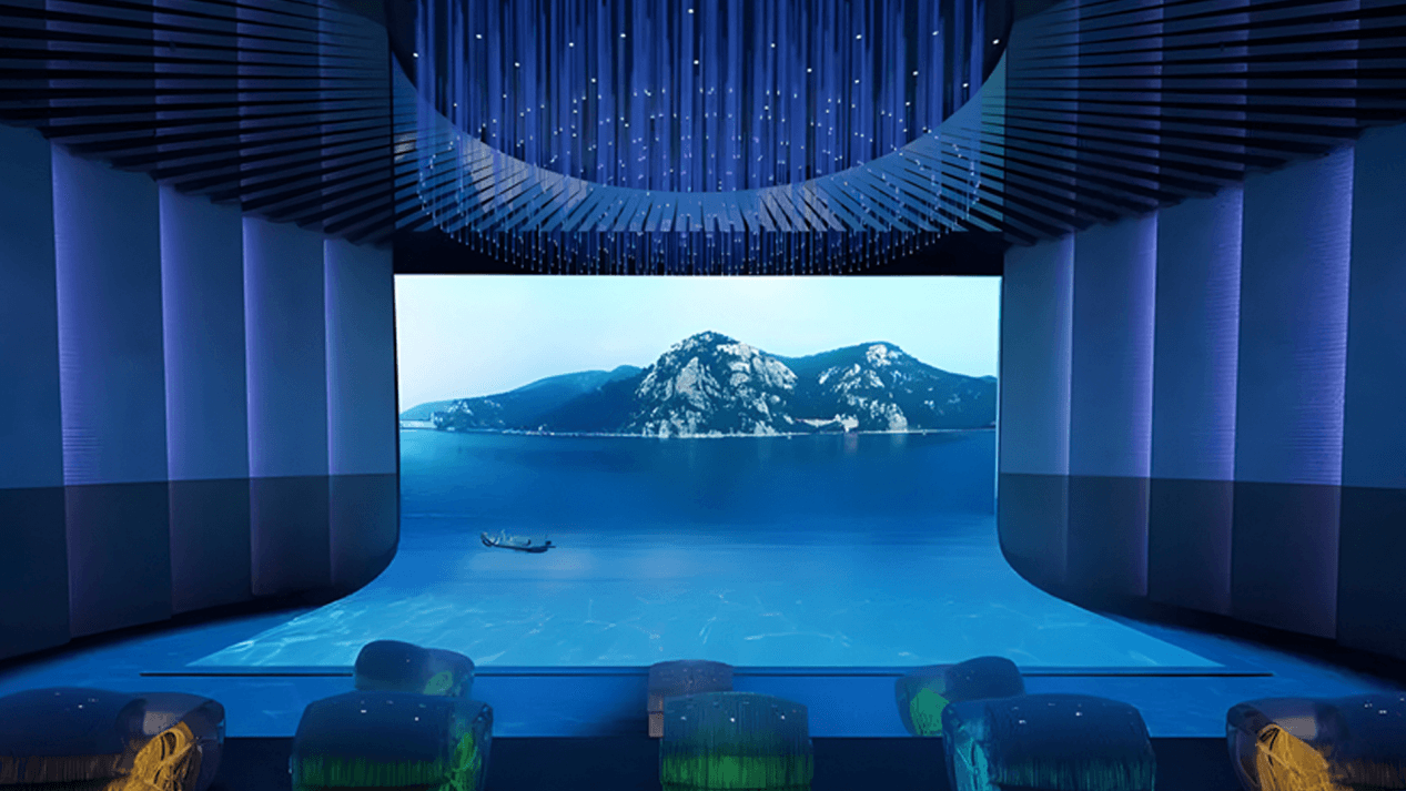 地幕为水平或呈一定倾斜,直幕垂直于地面,双幕之间通过圆弧形倒角进行连接过渡。当观众于地幕前,面向直幕进行观影体验,可产生居高临下的体验感受,呈现特别的裸眼3D即视效果。