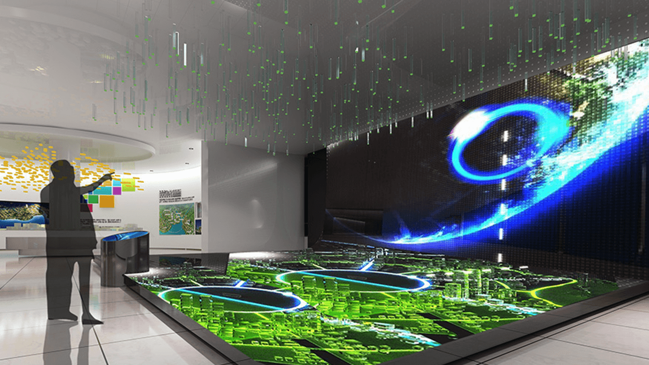 L幕投影的双幕可显示独立构图的画面,也可显示一个完整画面。双幕独立显示状态,地幕通常为显示俯瞰视角的顶视影像,如宏观的平面图,鸟瞰城市景观等大范围的内容。前幕显示与地幕配合的影像信息,如常规视角二维三维动画或文字信息。
