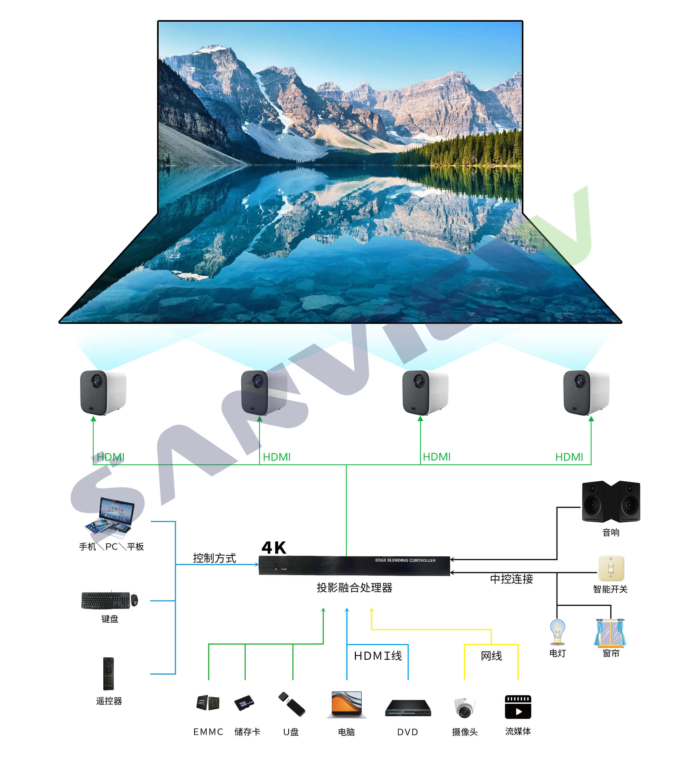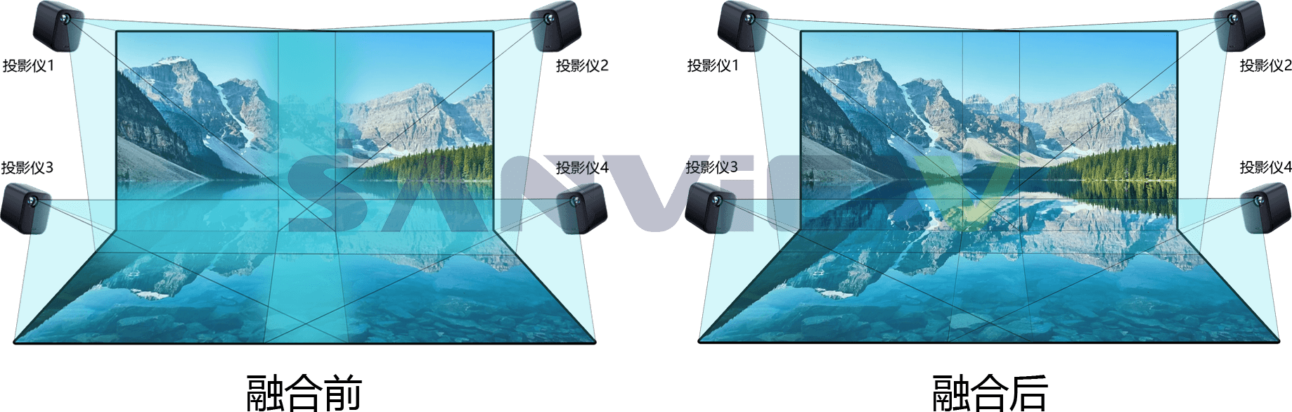 L幕投影是由空间的墙面和地面组成,通过DID、投影或LED显示系统,全新设计的L型墙体一体幕展示系统,将上下画面沉浸式融合在一起,盛显科技推出的投影融合处理器(投影融合服务器)可以轻松实现L幕投影的各种显示效果,一台设备集多窗口处理技术和边缘融合技术为一体,可实现视频多窗显示、边缘融合、边缘遮罩、几何校正、色差校正、多路信号源选择和预存场景自由调用等功能。