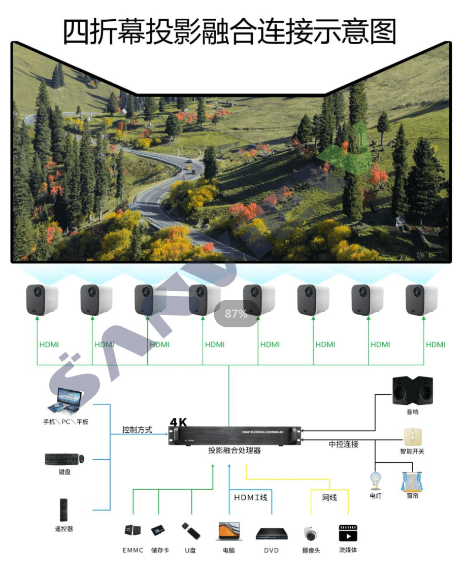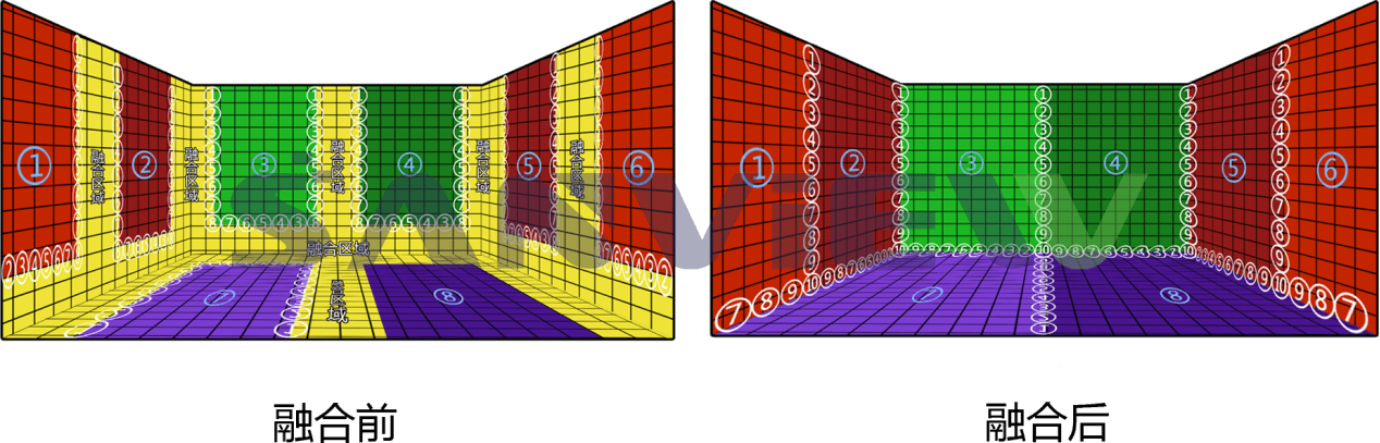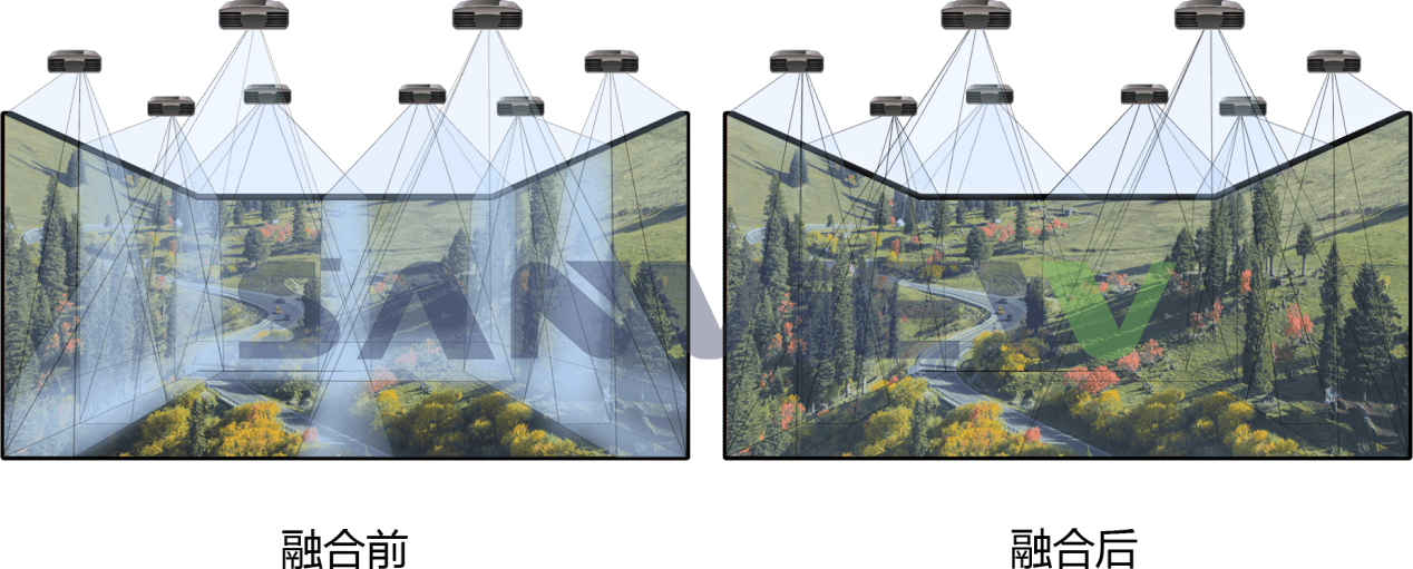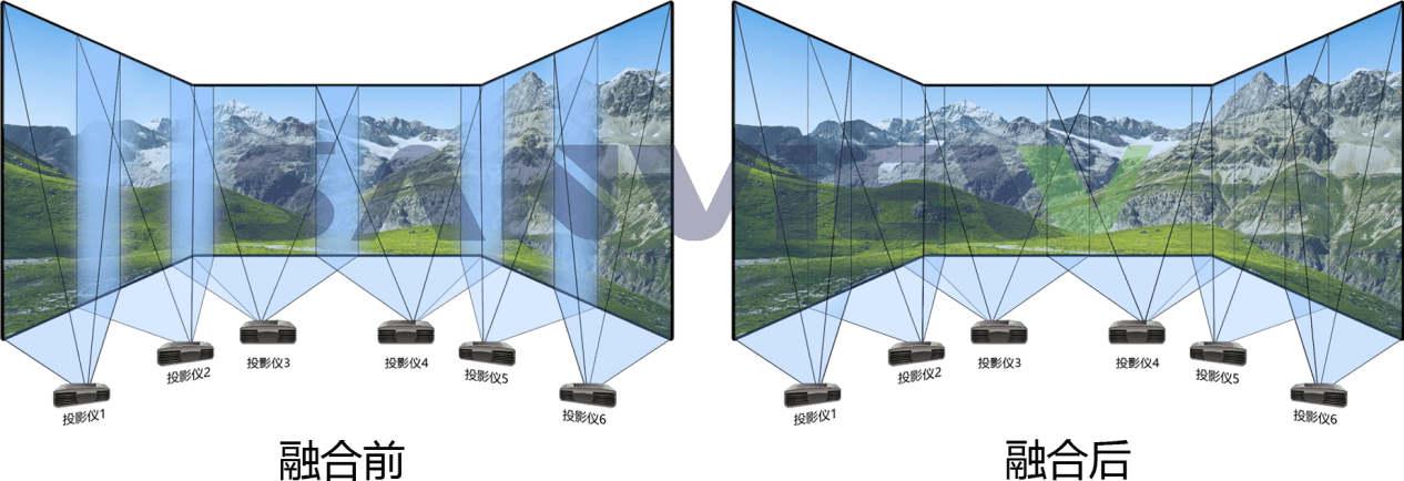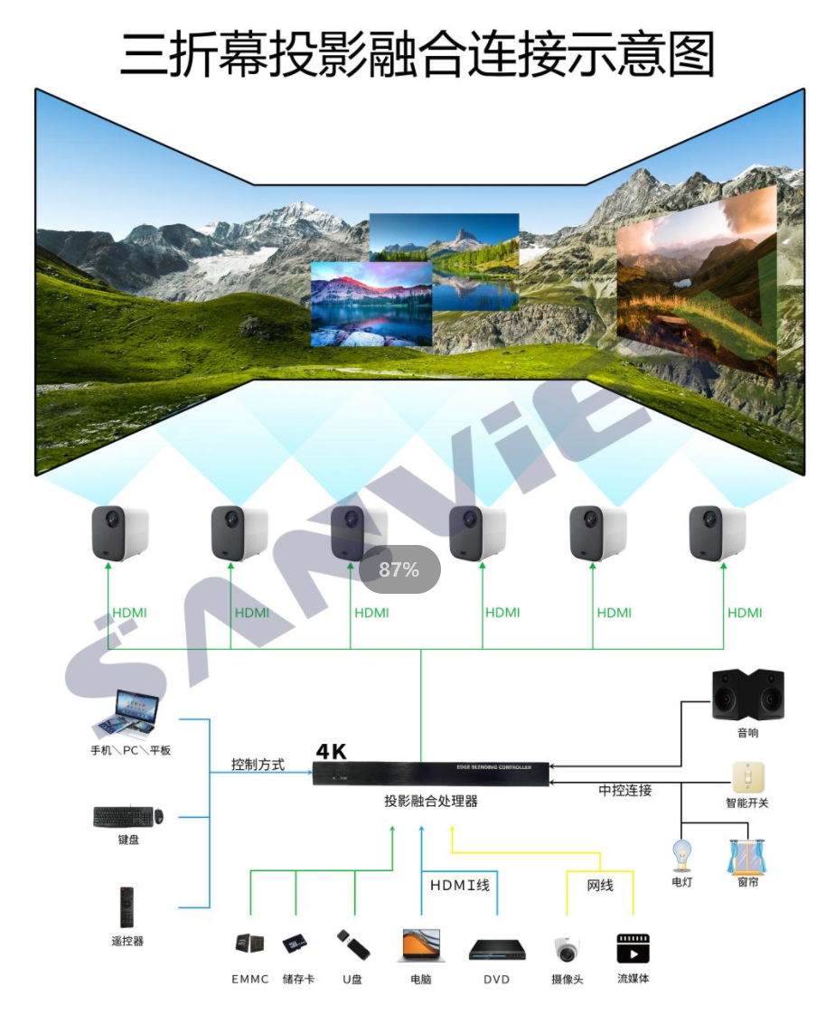 折幕投影是一种裸眼3D沉浸式虚拟现实系统,由3个面以上(含3面)硬质背投影墙组成,营造出沉浸感满满的虚拟演示环境,采用投影融合技术,通过多台投影机,创造出高清无缝的大屏逼真画面。盛显科技推出的投影融合处理器(投影融合服务器)可以轻松实现各种折幕投影的效果,一台设备完全集成了数字内容、投影系统、播放系统、融合软件几大模块,实现稳定可靠的硬融效果,解决了软融不稳定的各项难题。