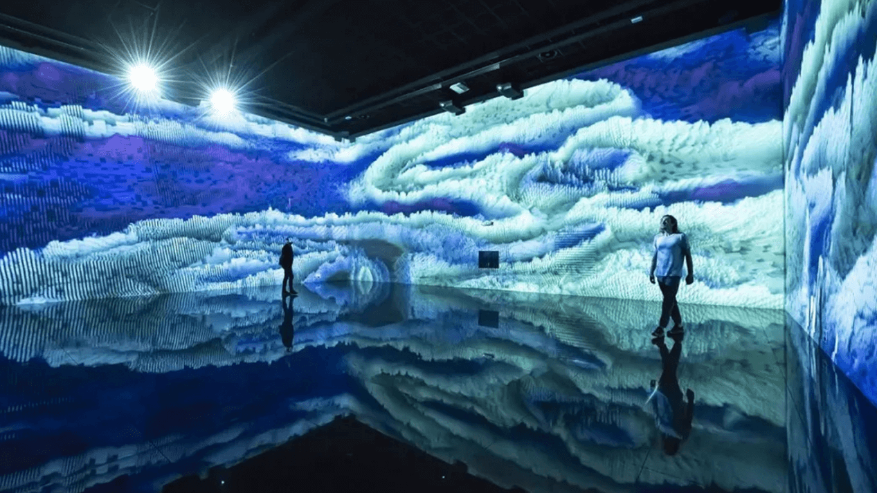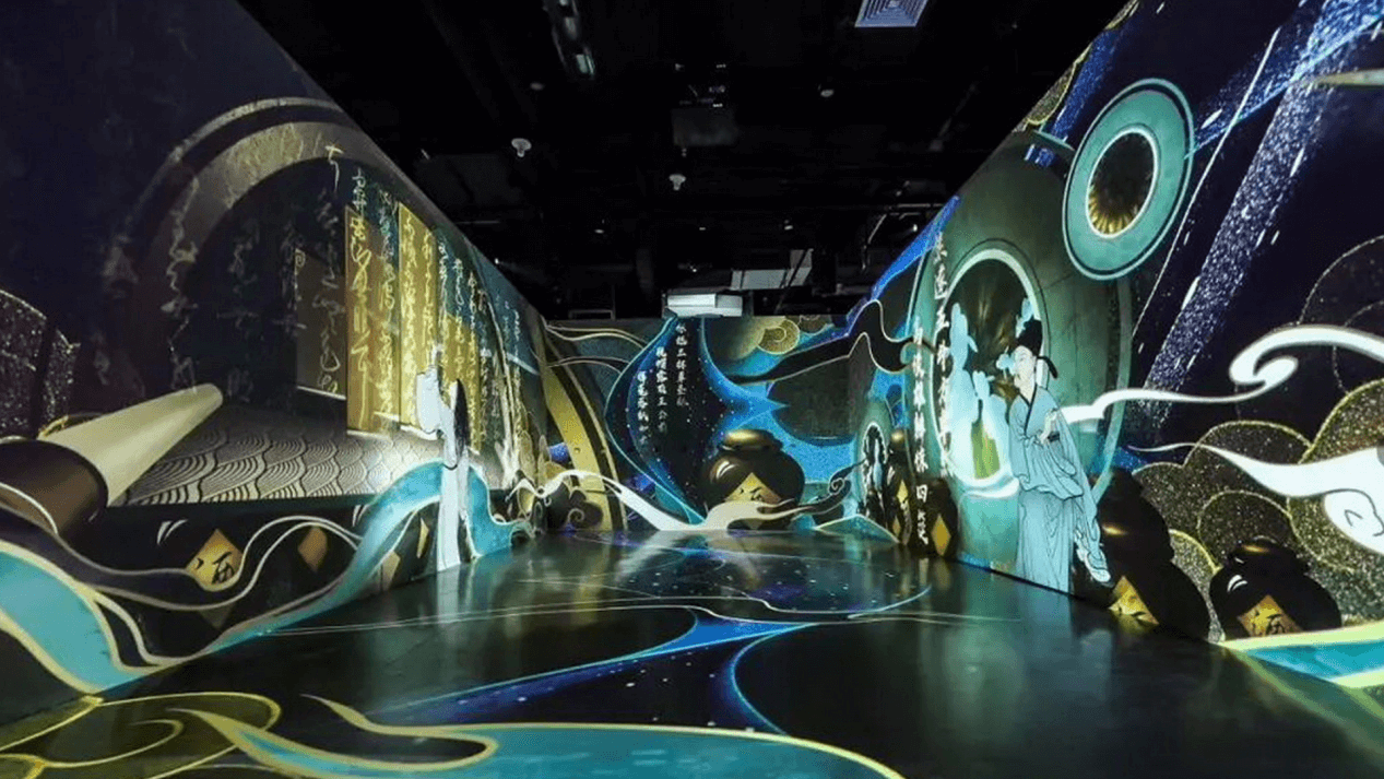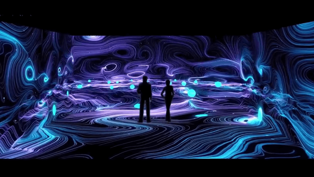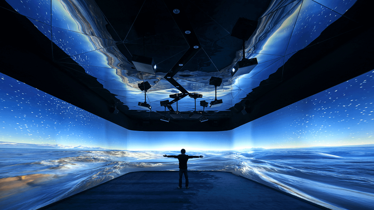 四折幕投影融合是由三块投影幕与地面相连,形成一个仿佛敞开式的“盒子”视觉空间,通过网格式几何校正融合技术将整个投影画面无缝衔接起来,多方位的展示画面,将观众包围在光影之中,产生强烈的现场参与感!