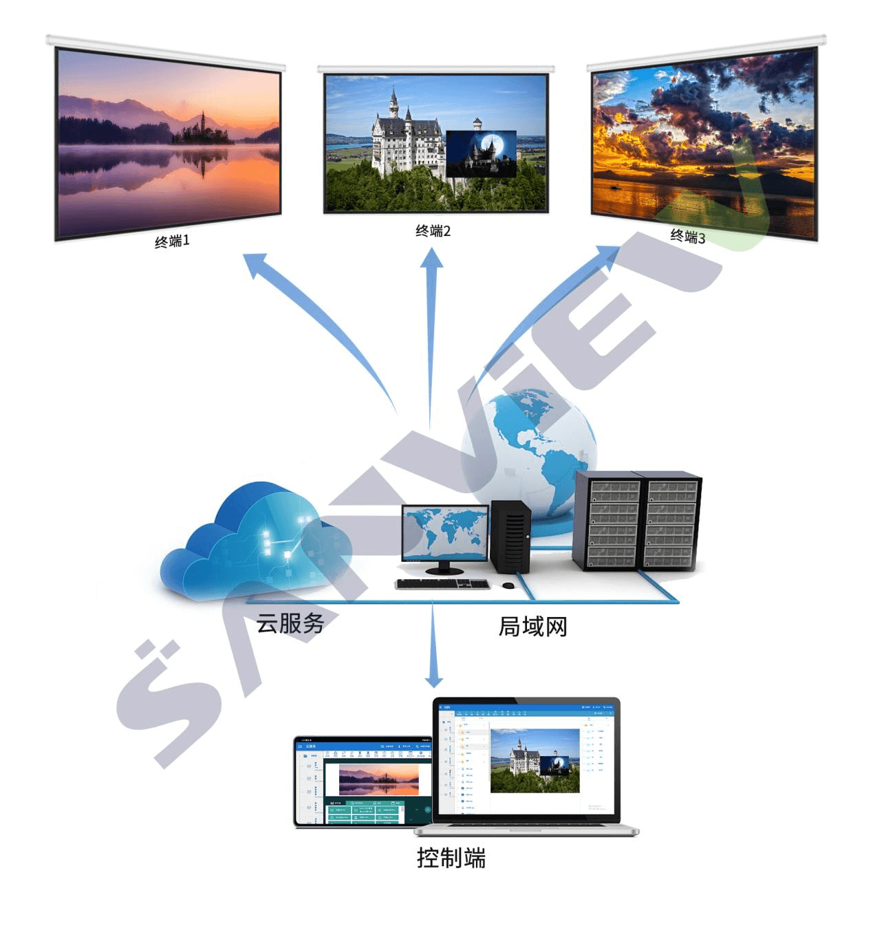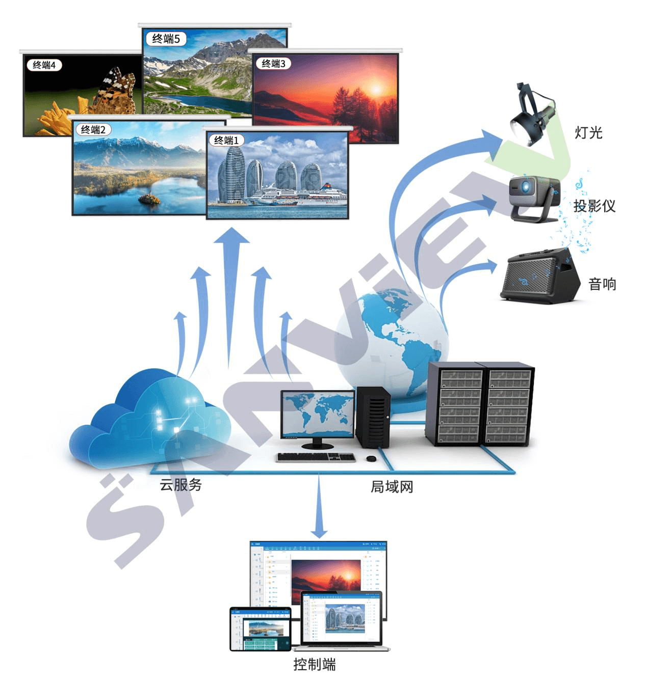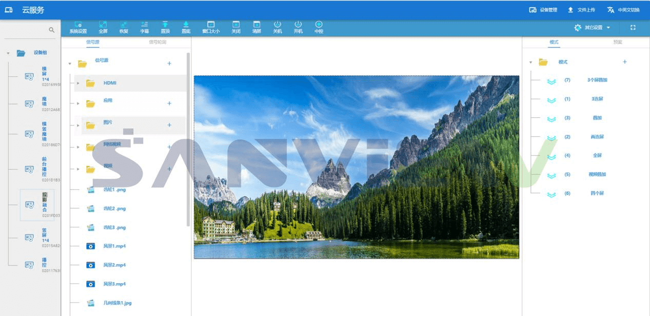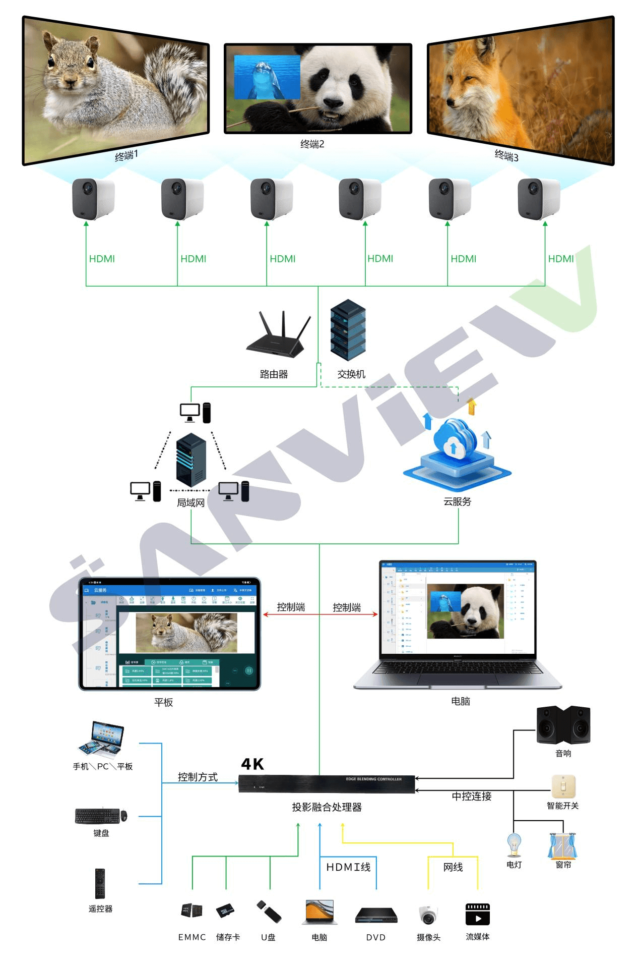 在展览展示等应用环境中,由于一般有多套投影融合系统,管理起来较为复杂,故设计一套智能化、人性化、科技化的可视化集控平台就变得尤为关键。基于该控制平台,可通过PC、Pad等实现对网络内的任意多台融合处理器进行统一管理、集中控制,同时投影融合画面能够实时在PC或Pad上进行回显,可以对融合处理器的运行状态进行实时监控。