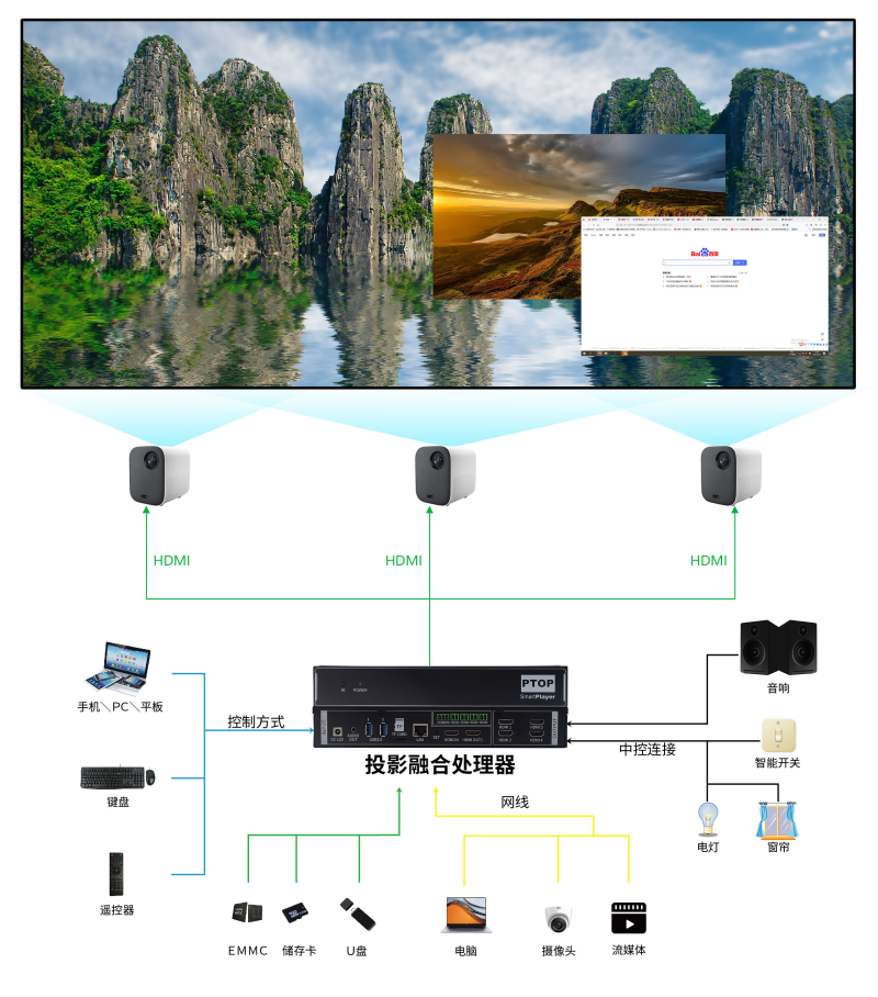投影融合处理器是一款专业的桌面图像融合硬件,通过图像几何矫正与边缘融合技术,可实现多通道投影图像融合,支持平面投影及曲面投影。集多媒体播控、信息发布、集群管理功能和应用平台为一体,具备强大的交互和播放能力。