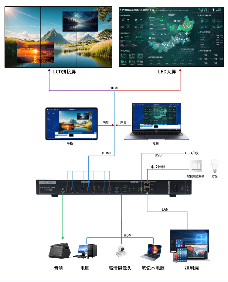 支持多个信号源上墙、拼接、漫游、跨屏、放大缩小、画中画、画外画、画面叠加等各种方式的显示功能,支持PC、平板等多种控制方式。