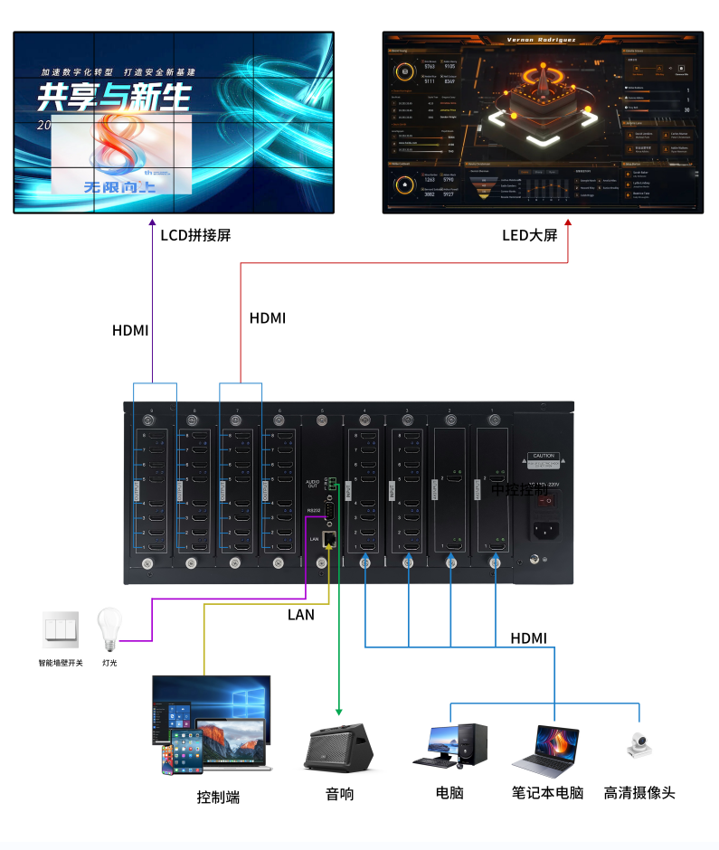 支持多个信号源上墙、拼接、漫游、跨屏、放大缩小、画中画、画外画、画面叠加等各种方式的显示,以及视频通道可实现无缝切换、预设场景、HDMI随路音频输出、独立立体声音频输出等功能。支持PC、平板等多种控制方式。