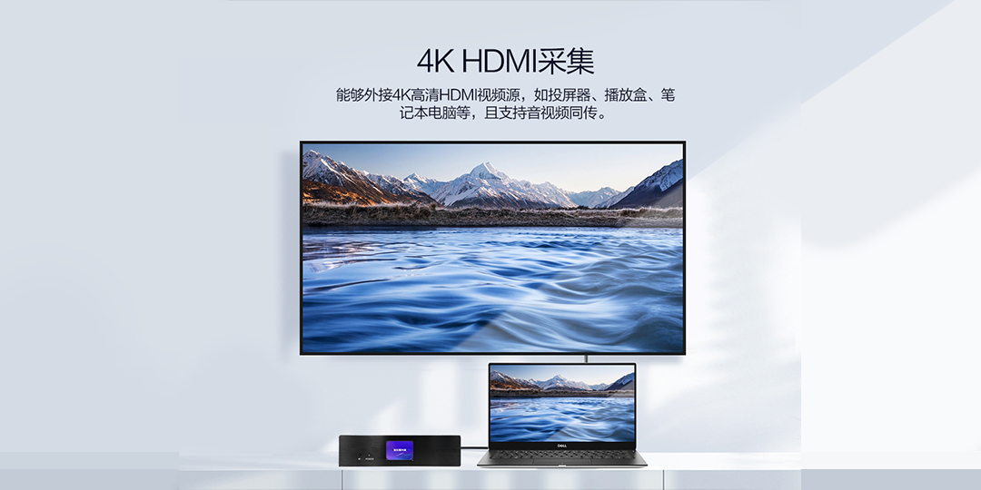 5.4K HDMI采集。能够外接4K高清HDMI视频源,如投屏器、播放盒、笔记本电脑等,且支持音视频同传。