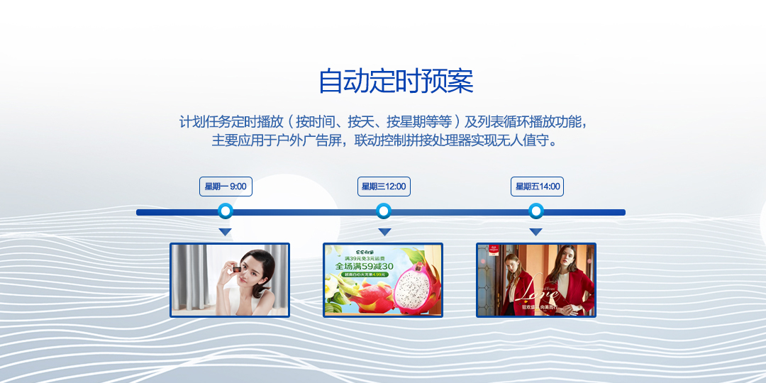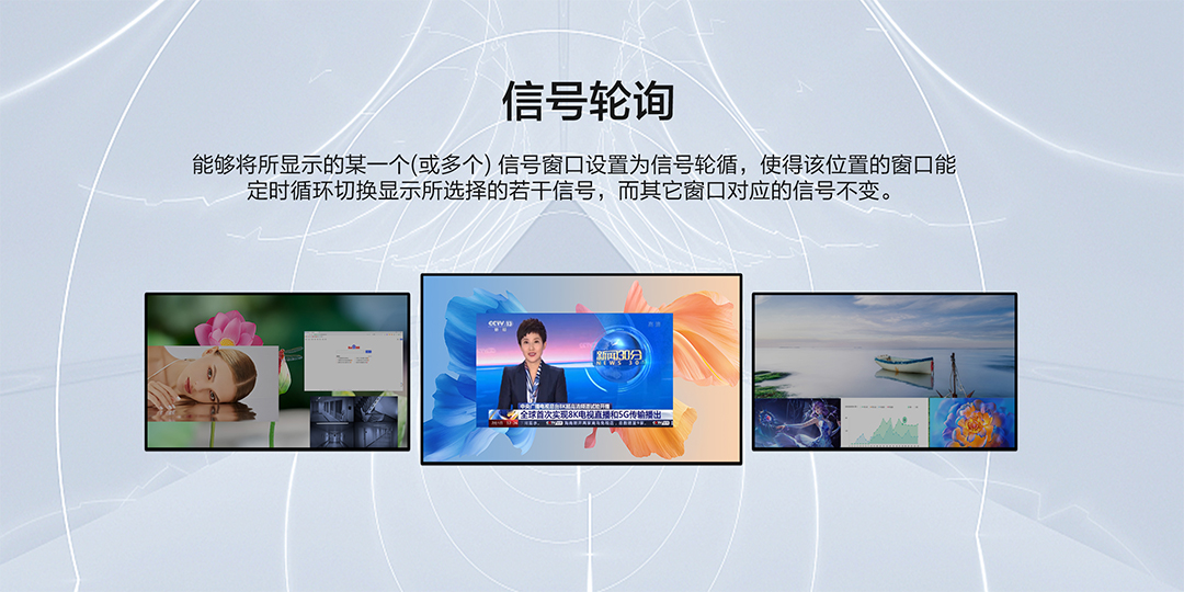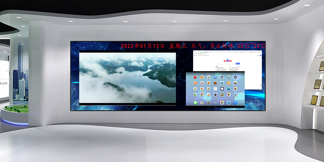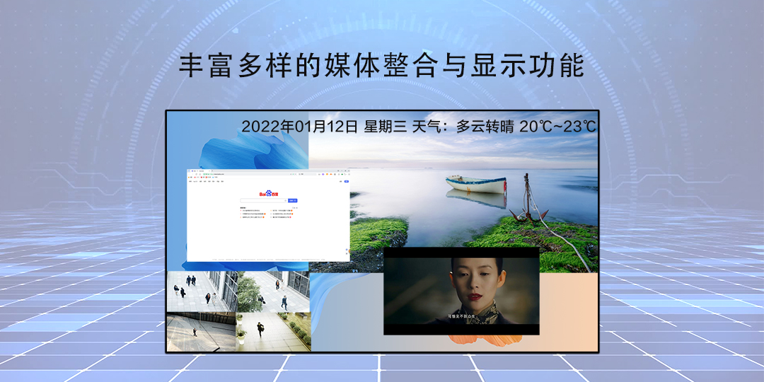 6.丰富多样的媒体整合与显示功能。除4K HDMI采集外,还能够整合音视频文件、图片、web网页等各种媒体,在拼接屏上按照预设的布局进行展示。同时还能融合天气预报、时钟信息、飞行字幕等日常信息的显示。