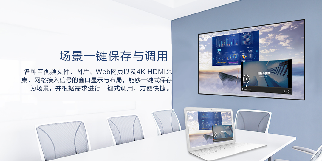 9.场景保存与调用。各种音视频文件、图片、Web网页以及4K HDMI采集、网络接入信号的窗口显示与布局,能够一键式保存为场景,并根据需求进行一键式调用,方便快捷。