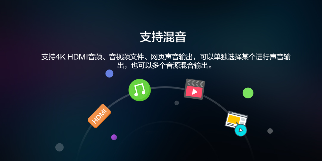 12.支持混音。支持4K HDMI音频、音视频文件、网页声音输出,可以单独选择某个进行声音输出,也可以多个音源混合输出。