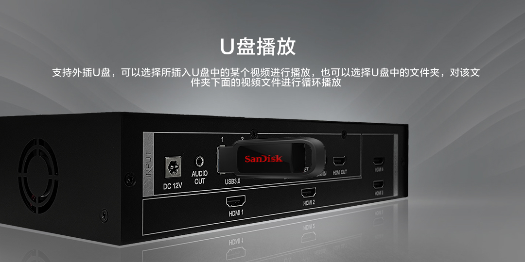 13.U盘播放。拼接盒除了自带64G的存储之外,还支持外插U盘,可以选择所插入U盘中的某个视频进行播放,也可以选择U盘中的文件夹,对该文件夹下面的视频文件进行循环播放。