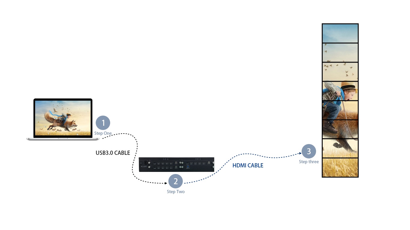 本产品是一款专门针对液晶电视、超窄边液晶屏、投影机的高清画面拼接处理器。HDMI 信号输出,连接液晶电视机或其它显示设备,每个输出口的分辨率达到1920*1080@60Hz。电脑配合此设备可以实现1*N、N*1、M*N以及90度旋转等比拼接显示,不变性,不拉伸,也可以实现 0 – 360度得任意旋转拼接实现艺术墙效果。可广泛应用于超高分辨率桌面应用、超大屏幕墙、指挥调度系统、多屏幕视频监控、工程显示应用,多通道投影、虚拟现实、环幕影院、大型广告墙、LCD/LED拼接屏等。