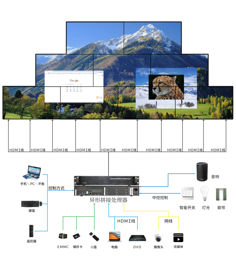 异形拼接屏是经过专门的设计之后,达到不规则拼接起来使用,同时辅以异形拼接处理器对图像进行专门处理,从而显示出不规则的信号画面,针对这一需求推出了一款功能强大操作简单的异形拼接处理器。