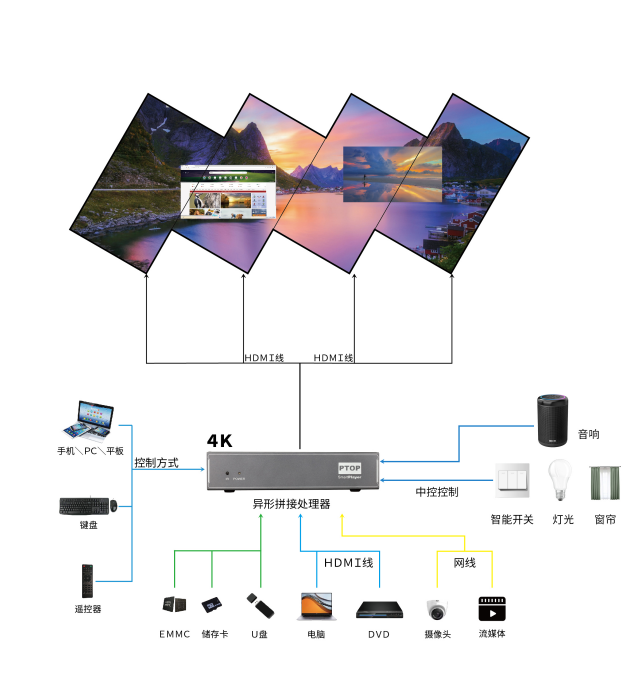 ✦丰富多样的媒体整合与显示功能。除4K HDMI采集外,还能够整合音视频文件、图片、web网页等各种媒体,在拼接屏上按照预设的布局进行展示。同时还能融合天气预报、时钟信息、飞行字幕等日常信息的显示。